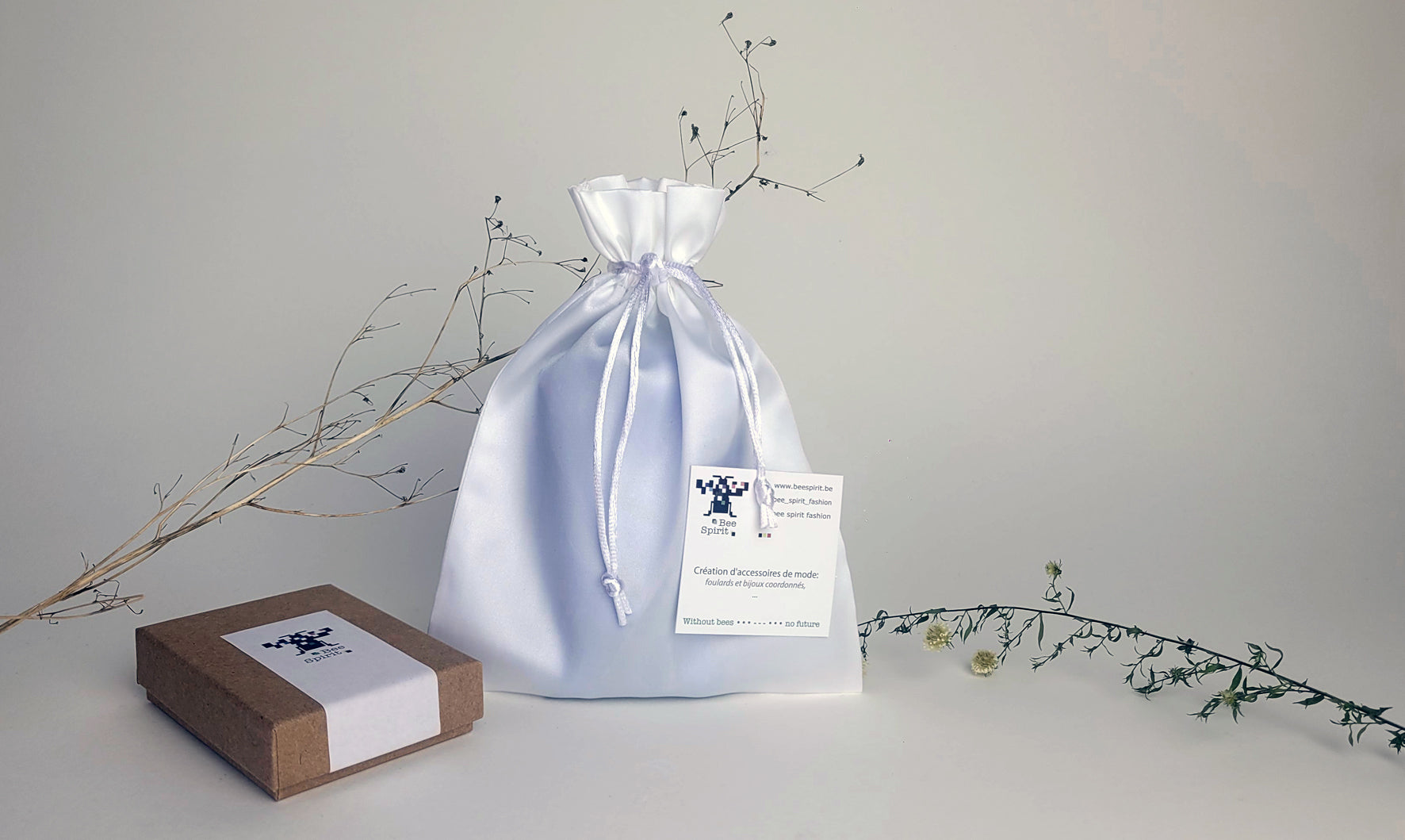 Les sacs en satin et le carton utilisé pour les cartes de visite, flyers, boites et enveloppes, sont faits de matériaux recyclés.